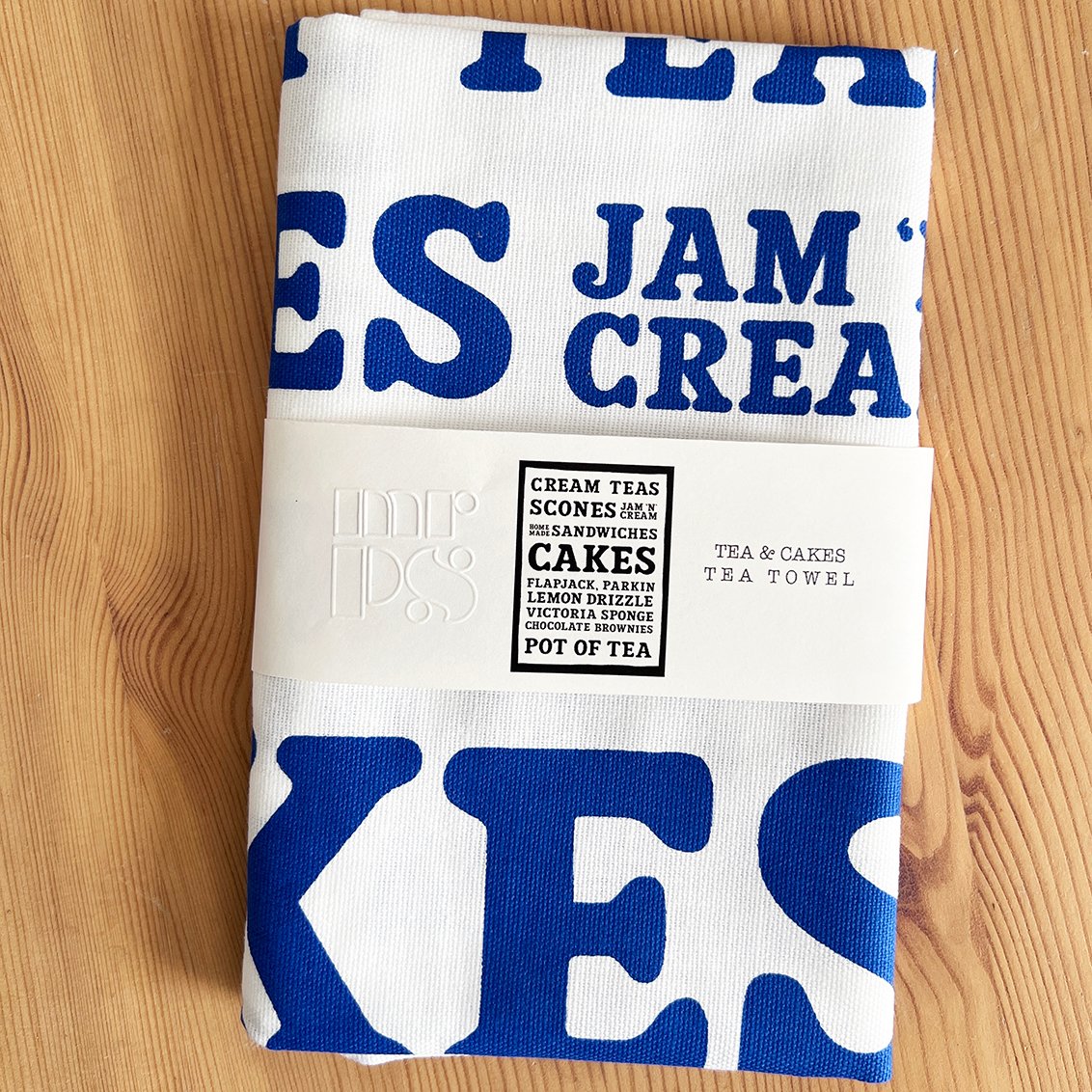The individual tea towel comes folded and wrapped in an embossed paper band.