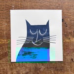 A happy cat screenprint to hang on your walls. With a serene smile and closed eyes, it is a calming, yet joyful image originally drawn by Robert Shadbolt.