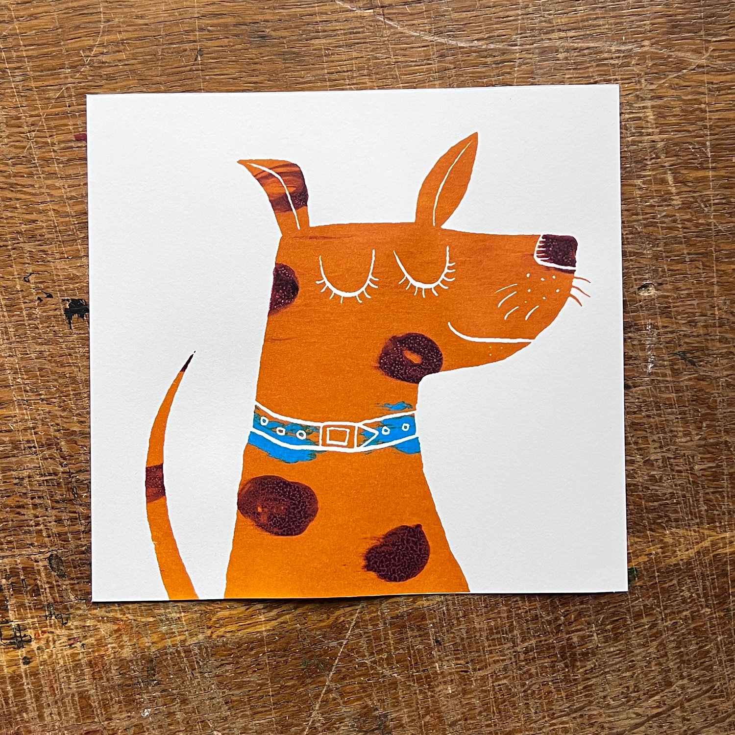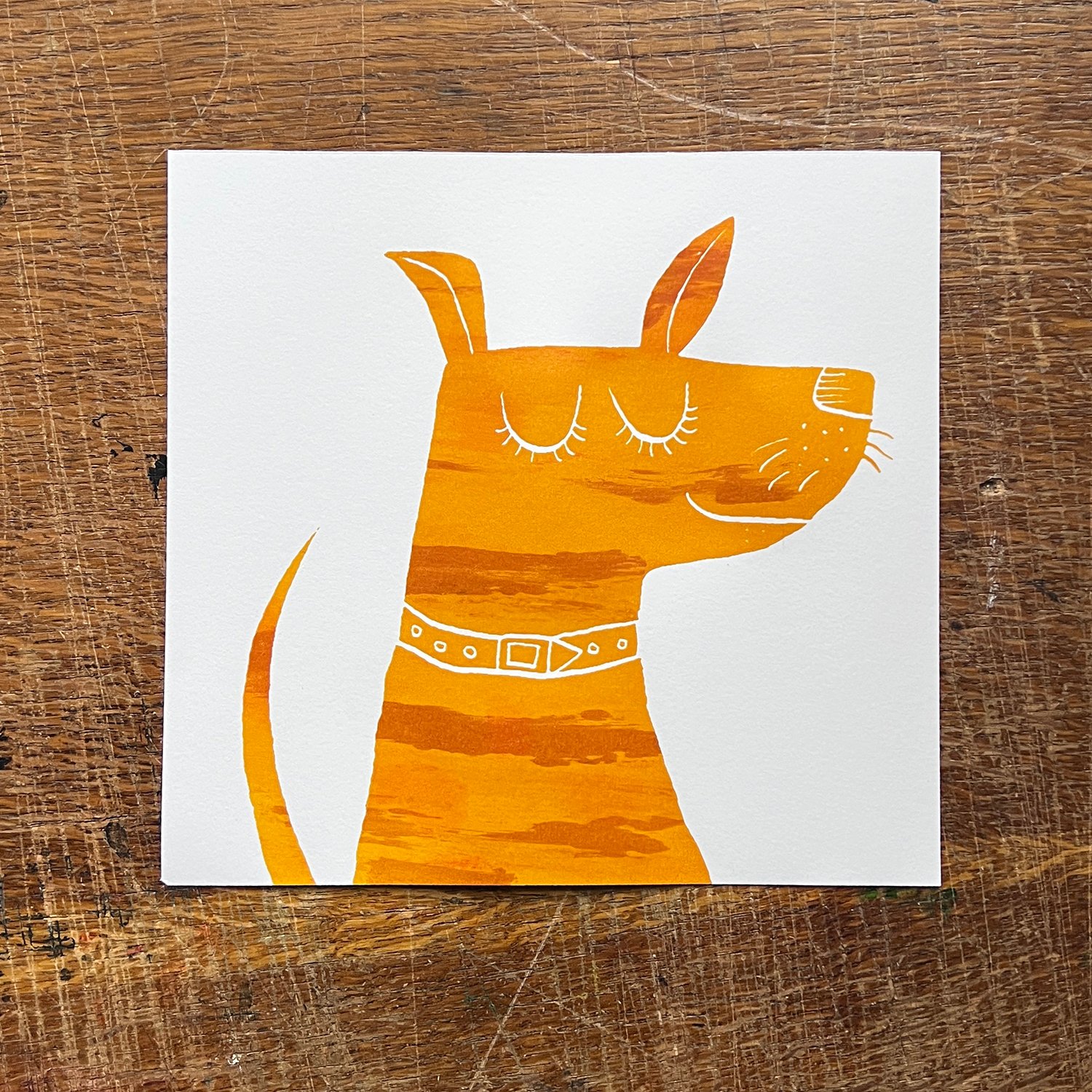 A happy dog screenprint to hang on your walls. With a serene smile and closed eyes, it is a calming, yet joyful image originally drawn by Robert Shadbolt.