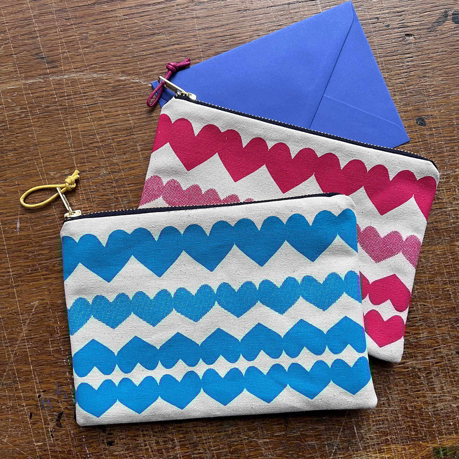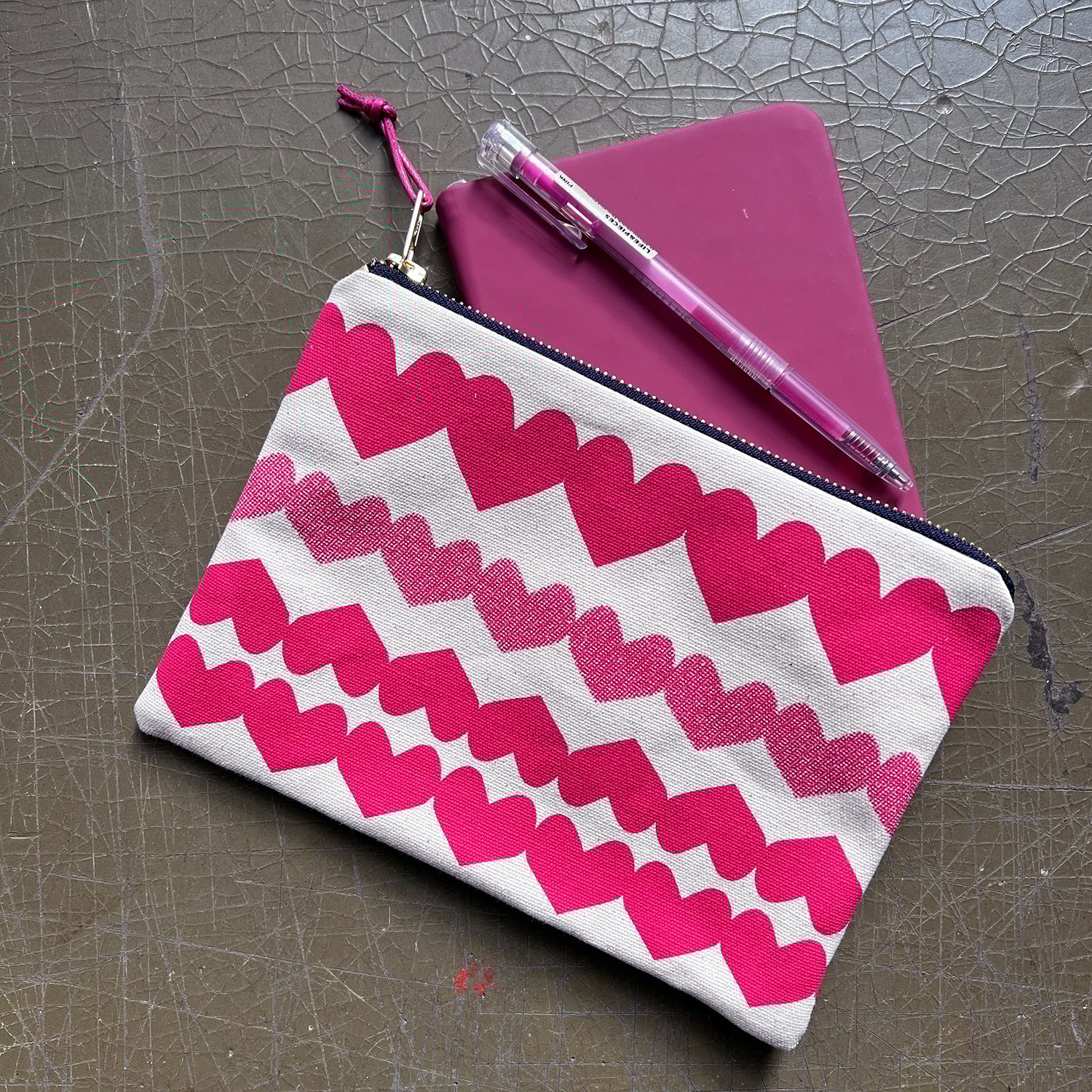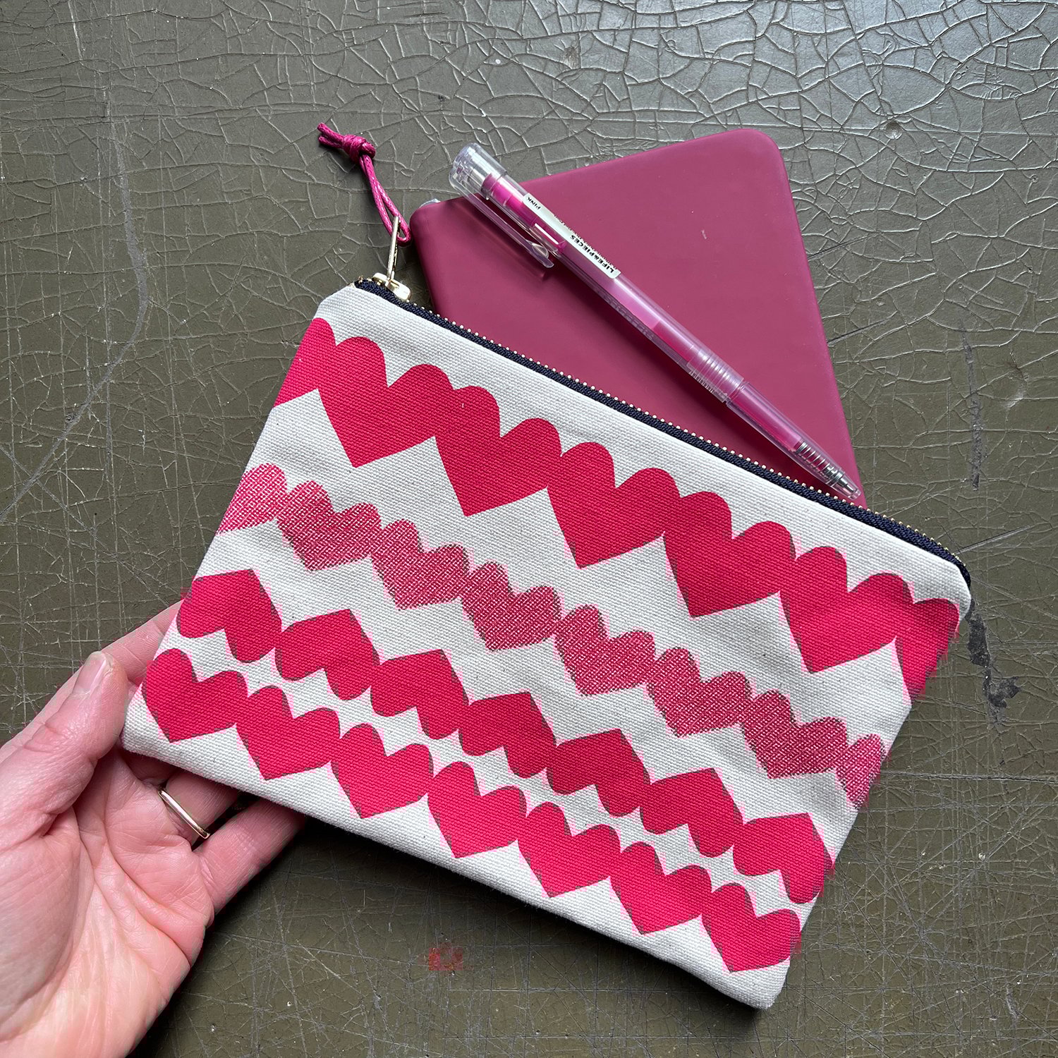 A large clutch purse screenprinted with a folk-inspired heart pattern. Rows of joined up hearts, originally created by cutting folded paper. Some have a half-tone dot, some are solid colour.