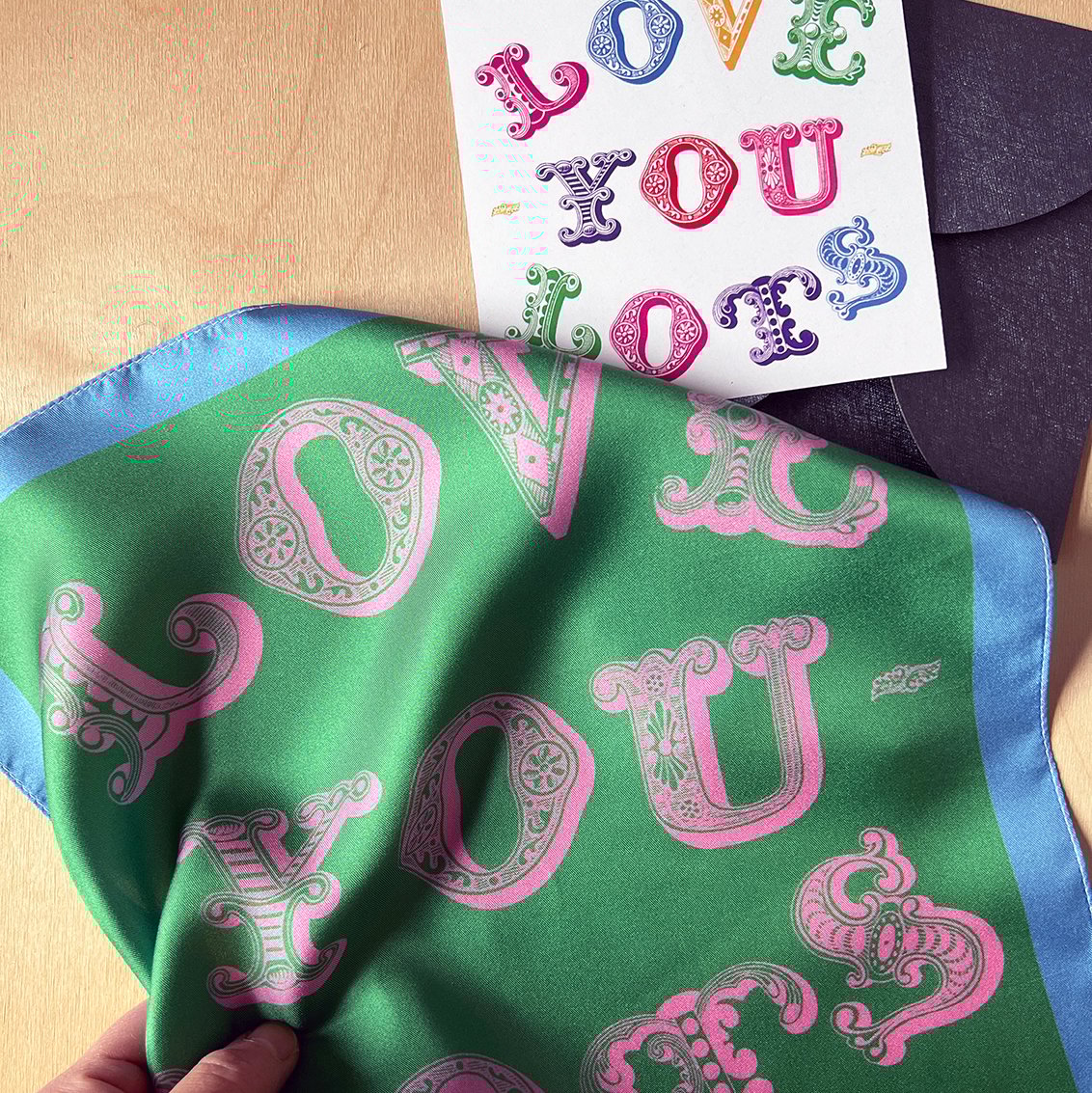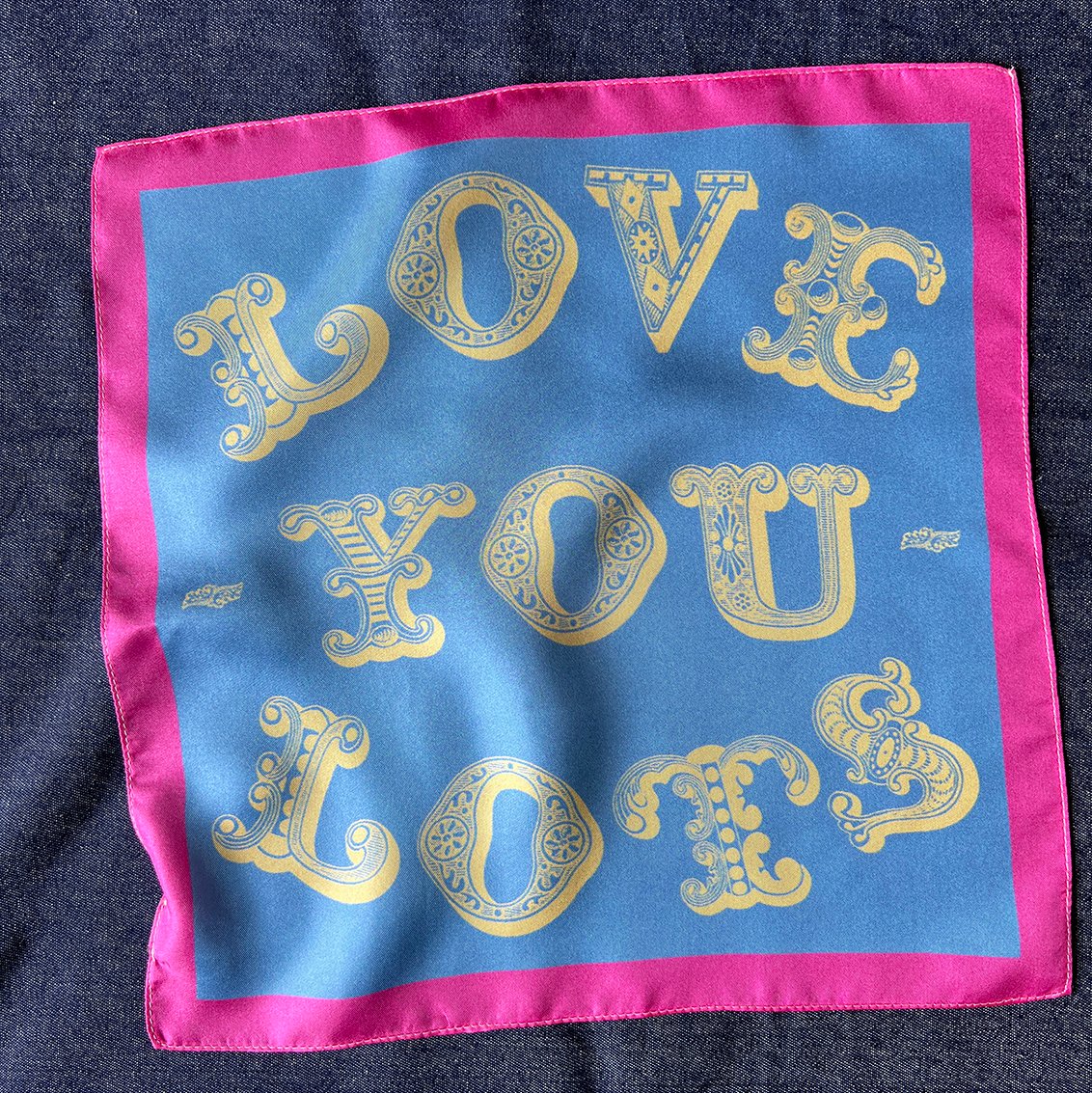 An individual 100% silk square printed with the words, Love You Lots.