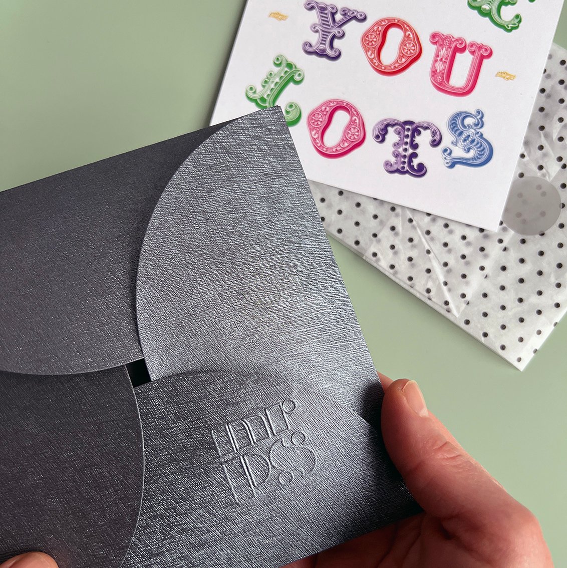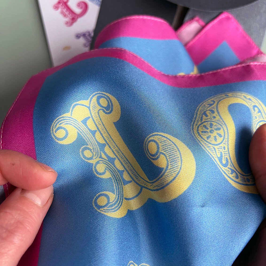 The silk square comes folded, wrapped in tissue paper and packaged in a textured pouchette, along with a printed card with room for you to write your personal message, if desired.