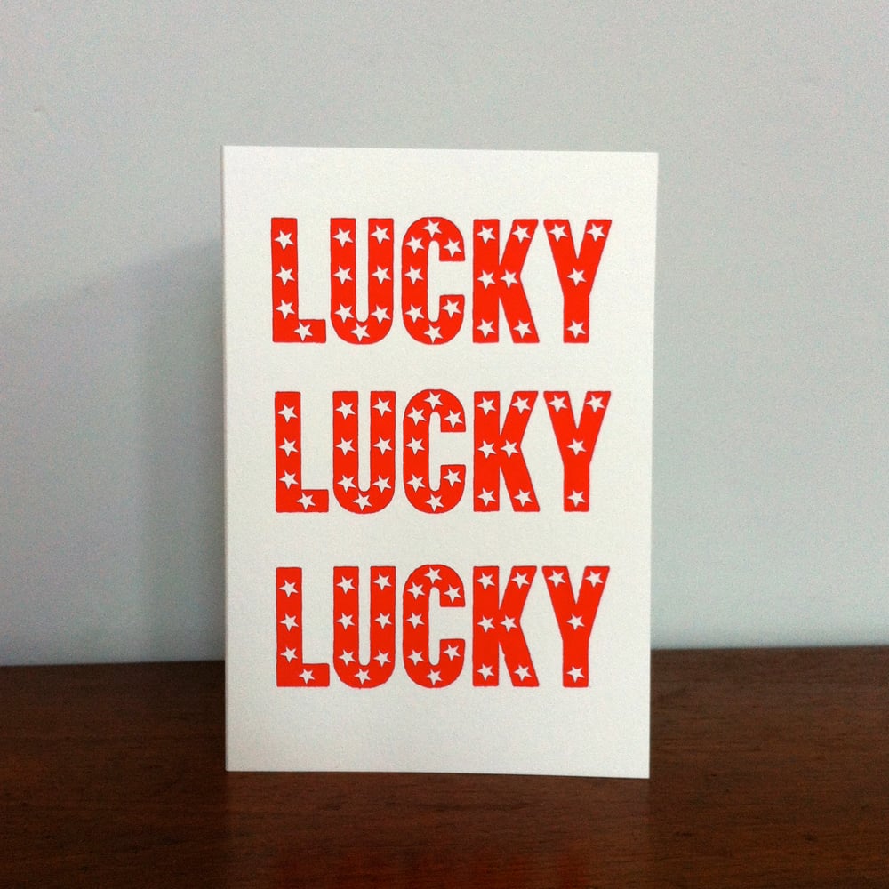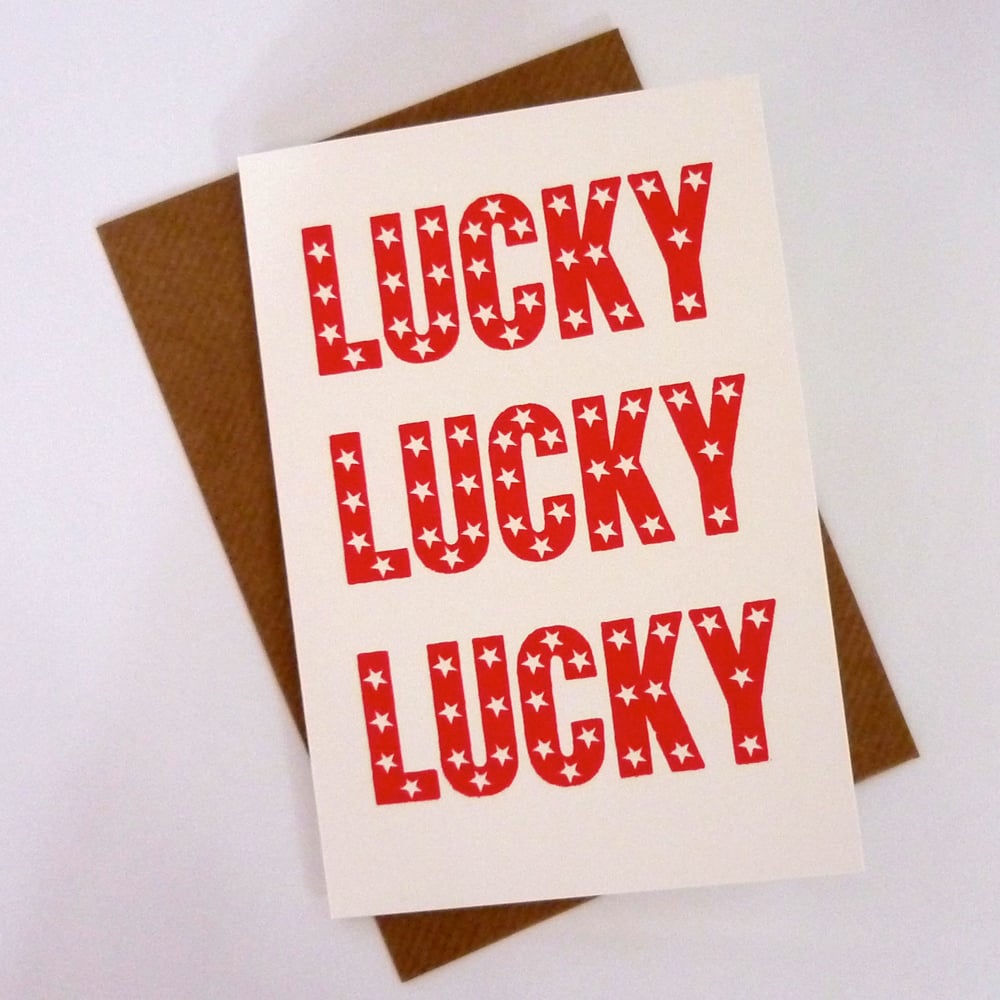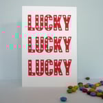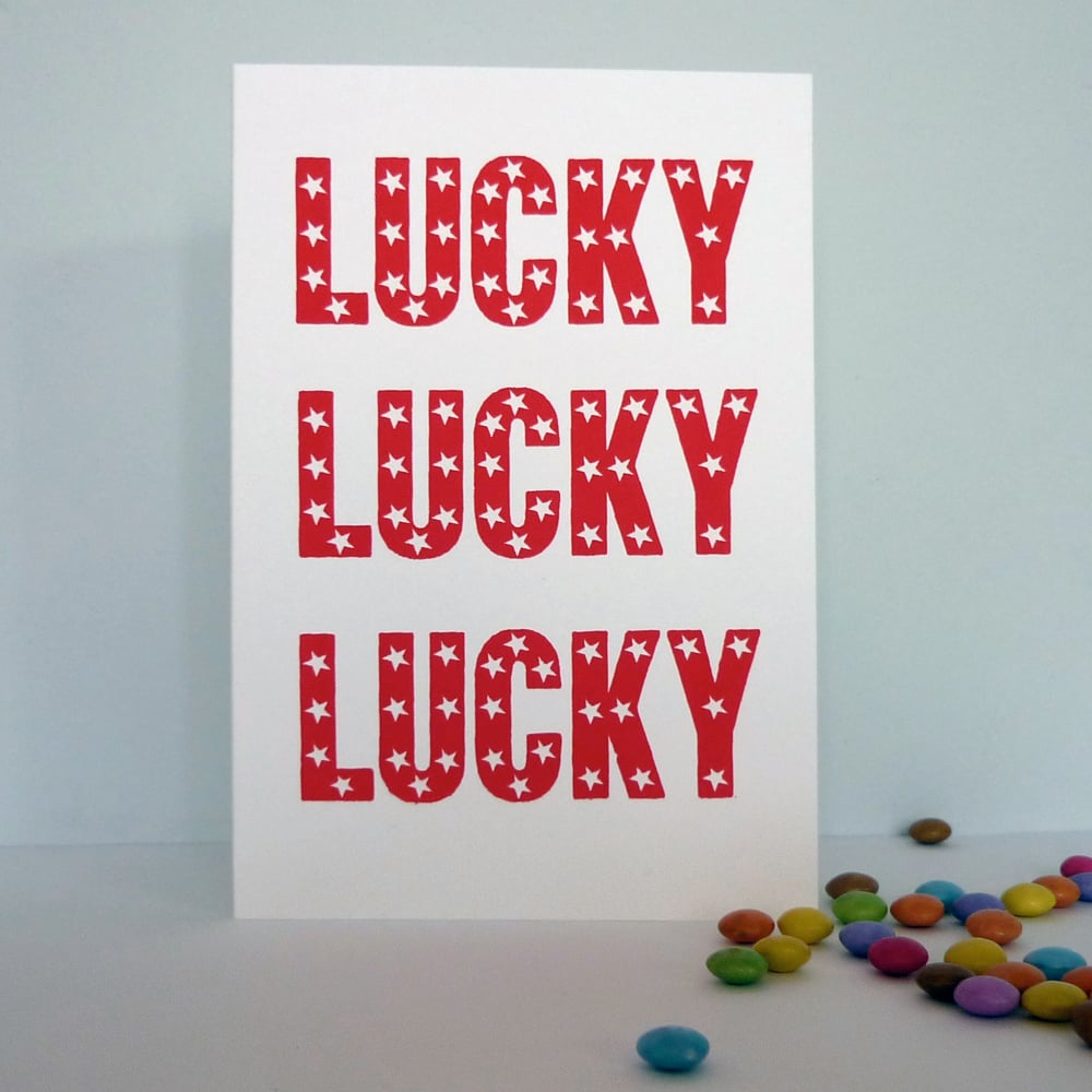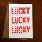 Send someone some good luck with this greeting card which is screenprinted with the words LUCKY LUCKY LUCK in red with white stars in the type.