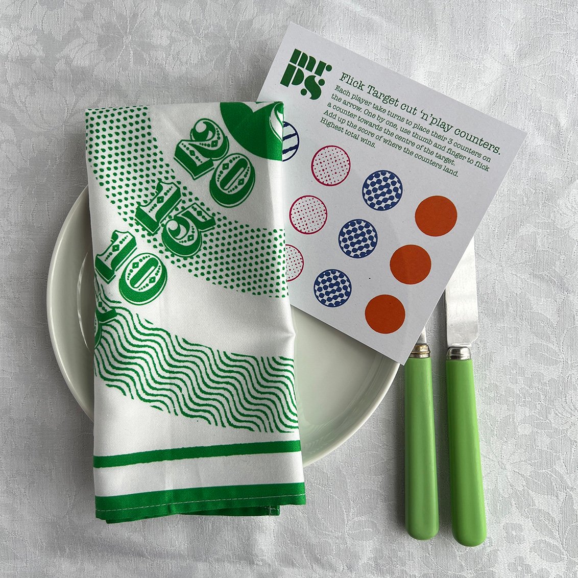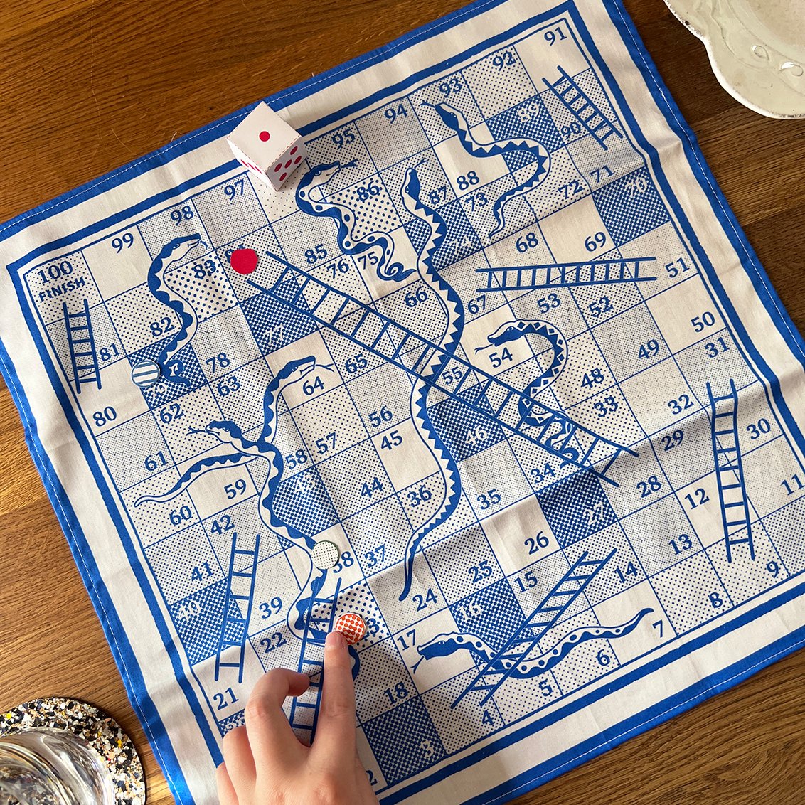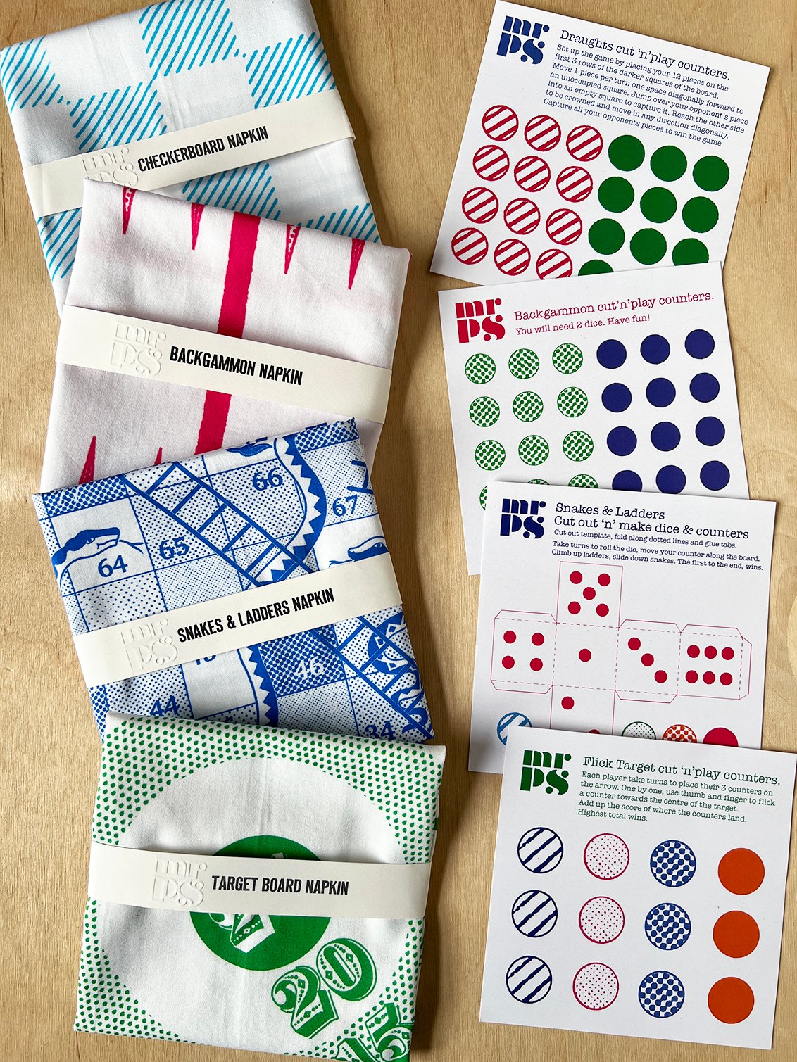 A set of four different playable board game printed cotton napkins, including printed cut-out counter cards enabling each game to be played.